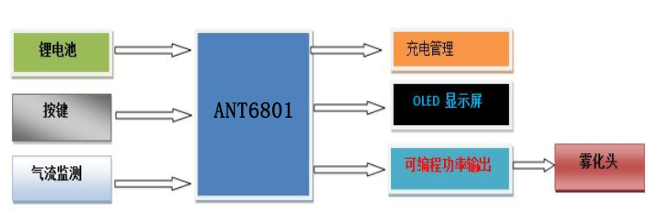 电子烟主要由气流监测器、控制电路、雾化头、LED、锂电池组成。吸烟时控制芯片可监测到气流流动,控制加热雾化头使发出模拟烟雾,沒有气流流过体内部時控制芯片进入到待机状态。