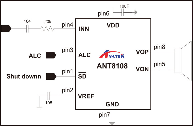 | 2 | ANT8108 | 5W/5V/2Ω | SOP-8 | 单声道 | 防破音 |